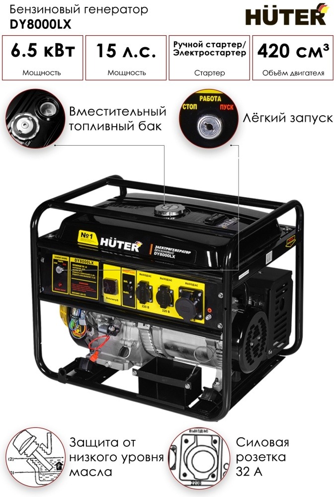 Электростанция бензиновая Huter, DY8000LX 6.5 кВт 1 (220 В)