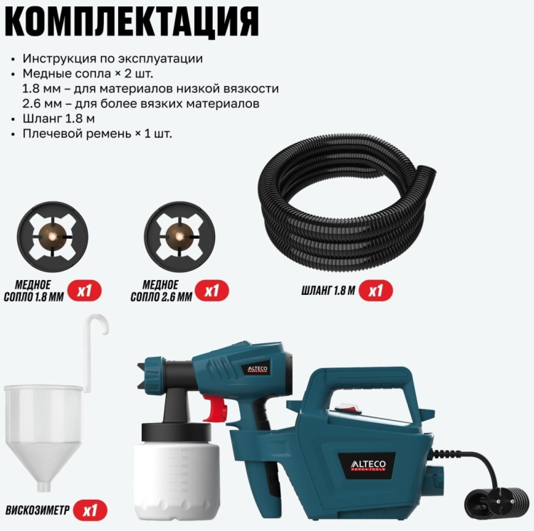 - Комплектация Вискозиметр 1 шт., шланг 1,8 м 1 шт., плечевой ремень, сопло 2.6 мм