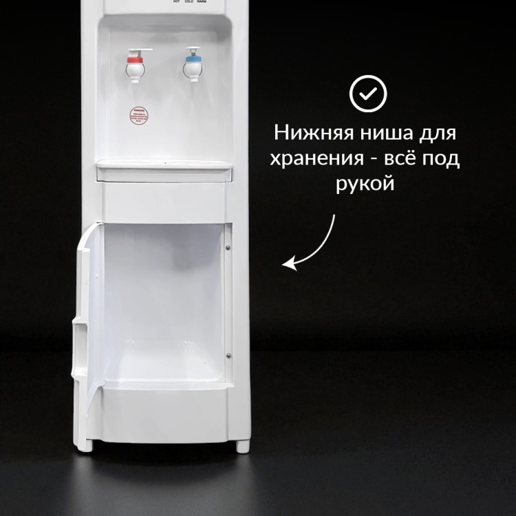 Соответствует всем характеристикам. Есть охлаждение и подогрев, вода холодная. В нижней части просто пространство для хранения. Поэтому всё соответствует. Покупкой довольны.