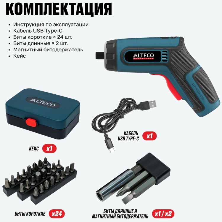 - Комплектация Кабель USB Type-C; набор бит: коротких - 24 шт., длинных - 2 шт.; битодержатель; пластиковый кейс.