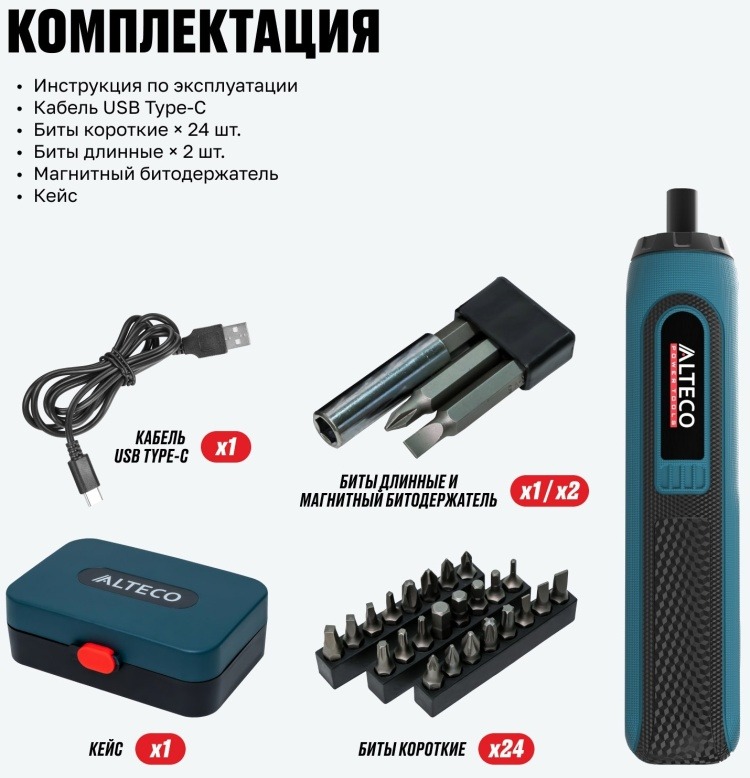 - Комплектация инструкция по эксплуатации, набор бит: коротких - 24 шт., длинных - 2 шт.; битодержатель; пластиковый кейс.