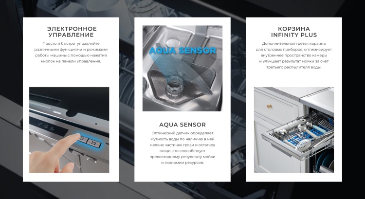 - Стандартные программы мойки обычная программа для повседневного мытья, интенсивная программа для сильнозагрязненной посуды, экспресс-программа (быстрый цикл), Eco, ночная программа