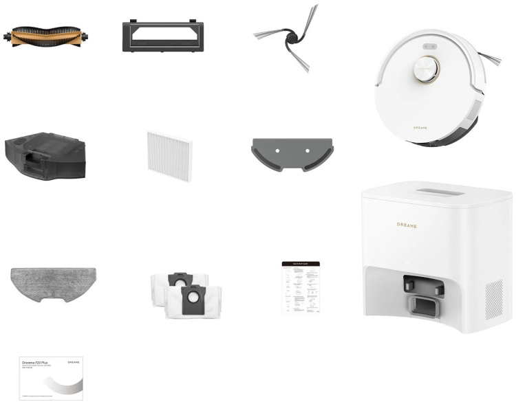 - В комплекте робот-пылесос, базовая станция, основная щетка, защита щетки, боковая щетка, резервуар 2 в 1, фильтр, держатель салфеток, салфетка для швабры, мешок для мусора (2 шт), документация