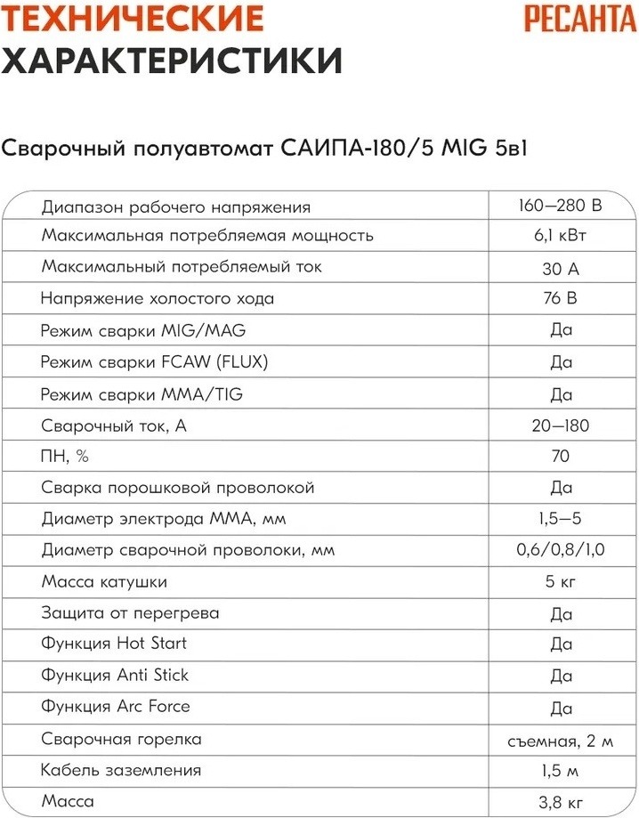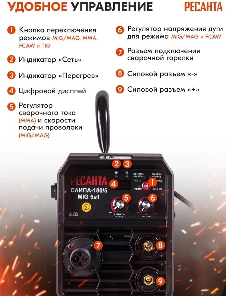 Сварочный полуавтомат Ресанта САИПА-180/5 MIG 5в1