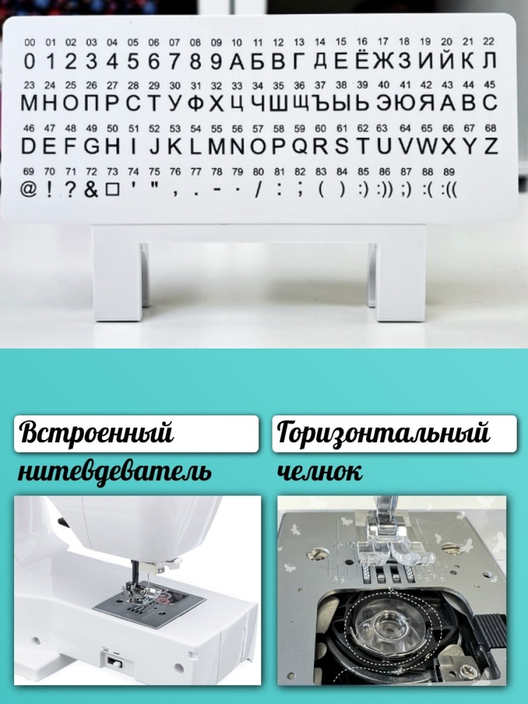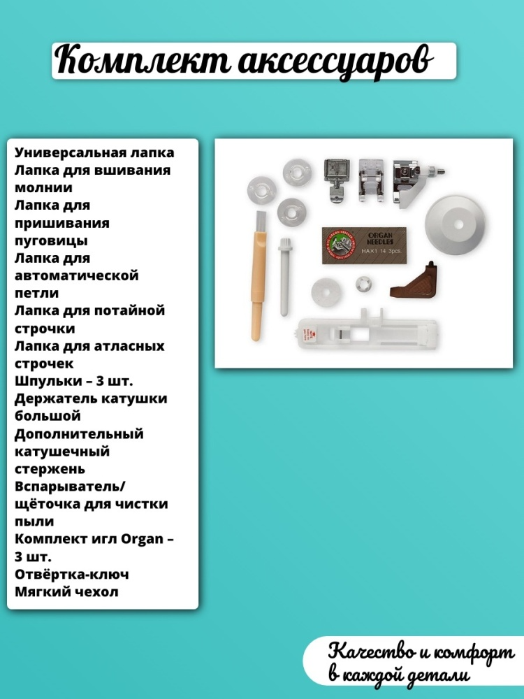 - Конструкция автоматический обрезатель нити, отсек для аксессуаров , нитедеватель , дисплей, рукавная платформа
