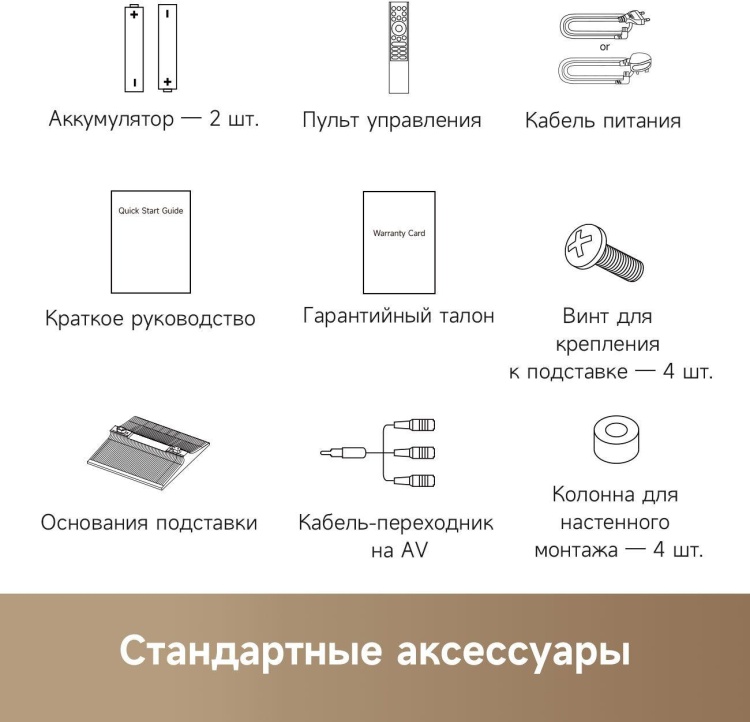 - Комплектация пульт ДУ, кабель HDMI, подставка , батарейки
