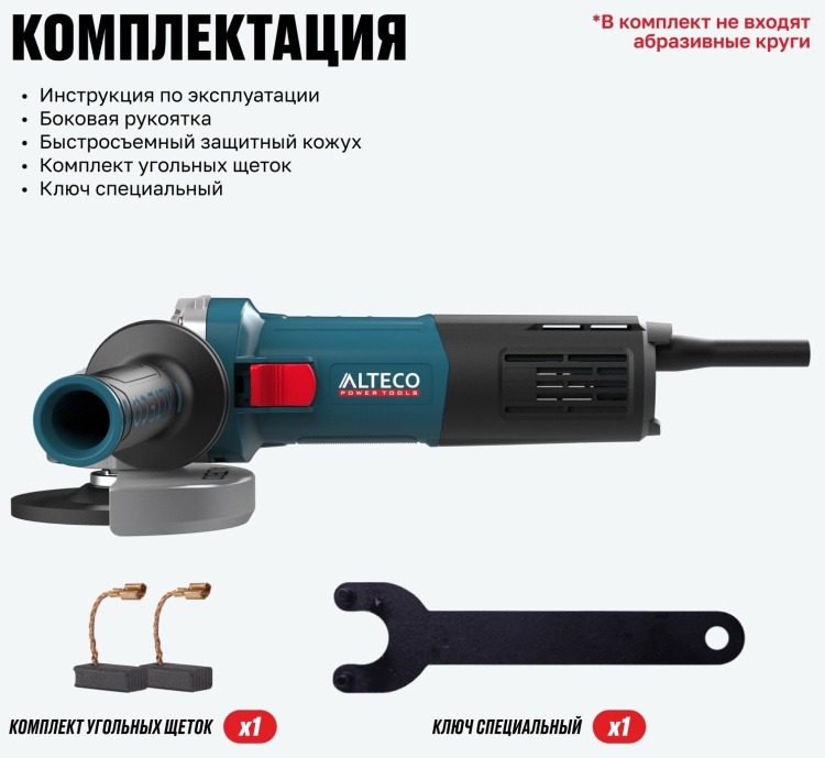 - Комплектация защитный кожух , боковая рукоятка , ключ, комплект угольных щеток